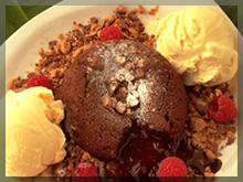ディナーの後のデザート ―当レストランを代表するデザートとなるオレオクッキーの上でチョコレート、コーヒー、バニラの3層のアイスクリームをファッジでわけ、生クリームで飾られたマッドパイ、又はチョコレートラバケーキ、キーライムパイ― が、その晩餐を完成形とします。